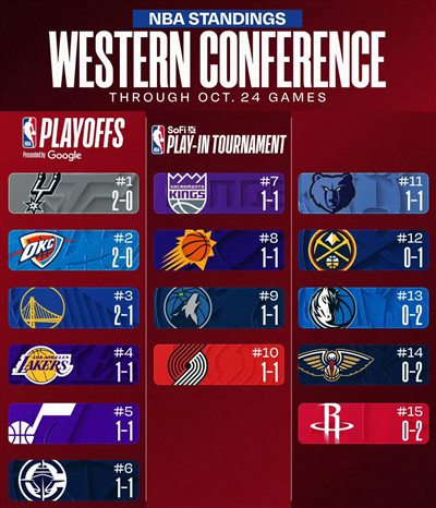 At present, after the first two games of the new season, the Rockets, Mavericks and Pelicans are all hard to win and are tied for last in the Western Conference, while the Spurs and defending champion Thunder lead the Western Conference with a record of 2 wins and 0 losses.