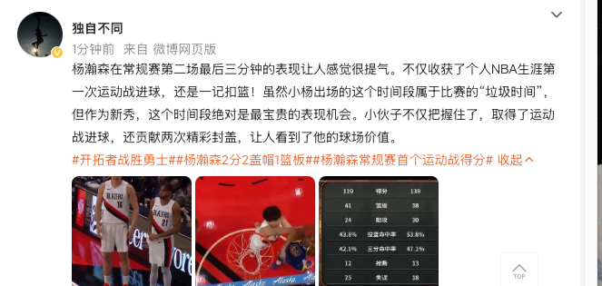 Yang Hansen's performance in the last three minutes of the second game of the regular season was very encouraging. Not only did he score his first sports game goal in his NBA career, it was also a slam dunk! Although the time period when Xiao Yang appeared was the "garbage time" of the competition, as a new player, this time period is definitely the most precious performance opportunity. The young man not only grasped it and scored a goal in the sports game, but also contributed two wonderful blocks, which showed his value in the game.