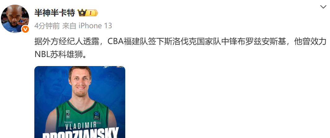 6686 Sports News on November 5 According to a report by domestic media person "Demigod Half Carter", according to foreign agents, the CBA Fujian team signed the Slovak national team No. 5 Brozianski, who once played for the NBL Suko Lions.