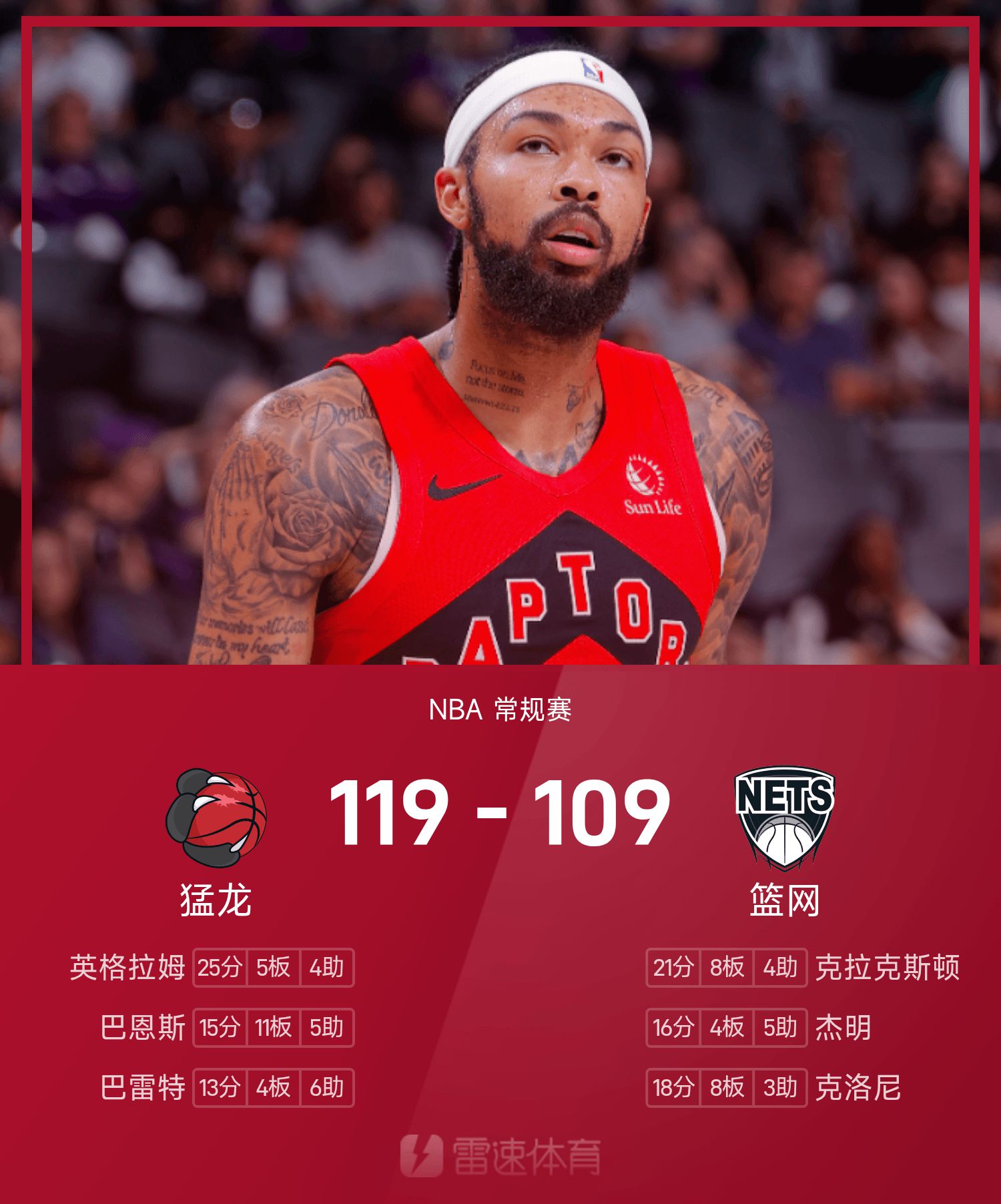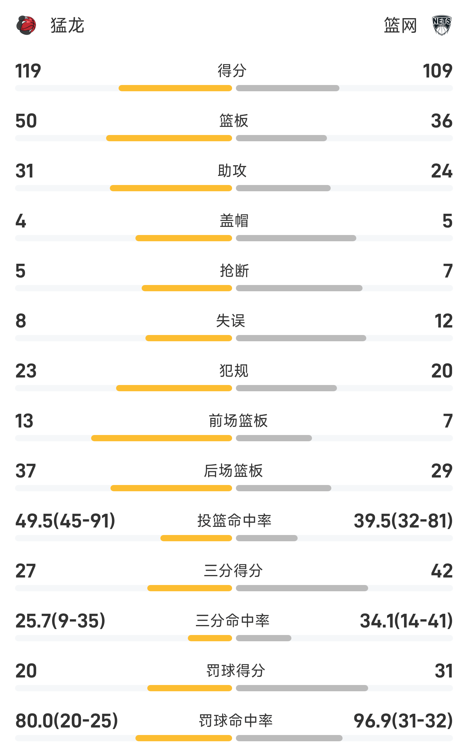 At the end of the game, the Nets lost to the Raptors 109-119.