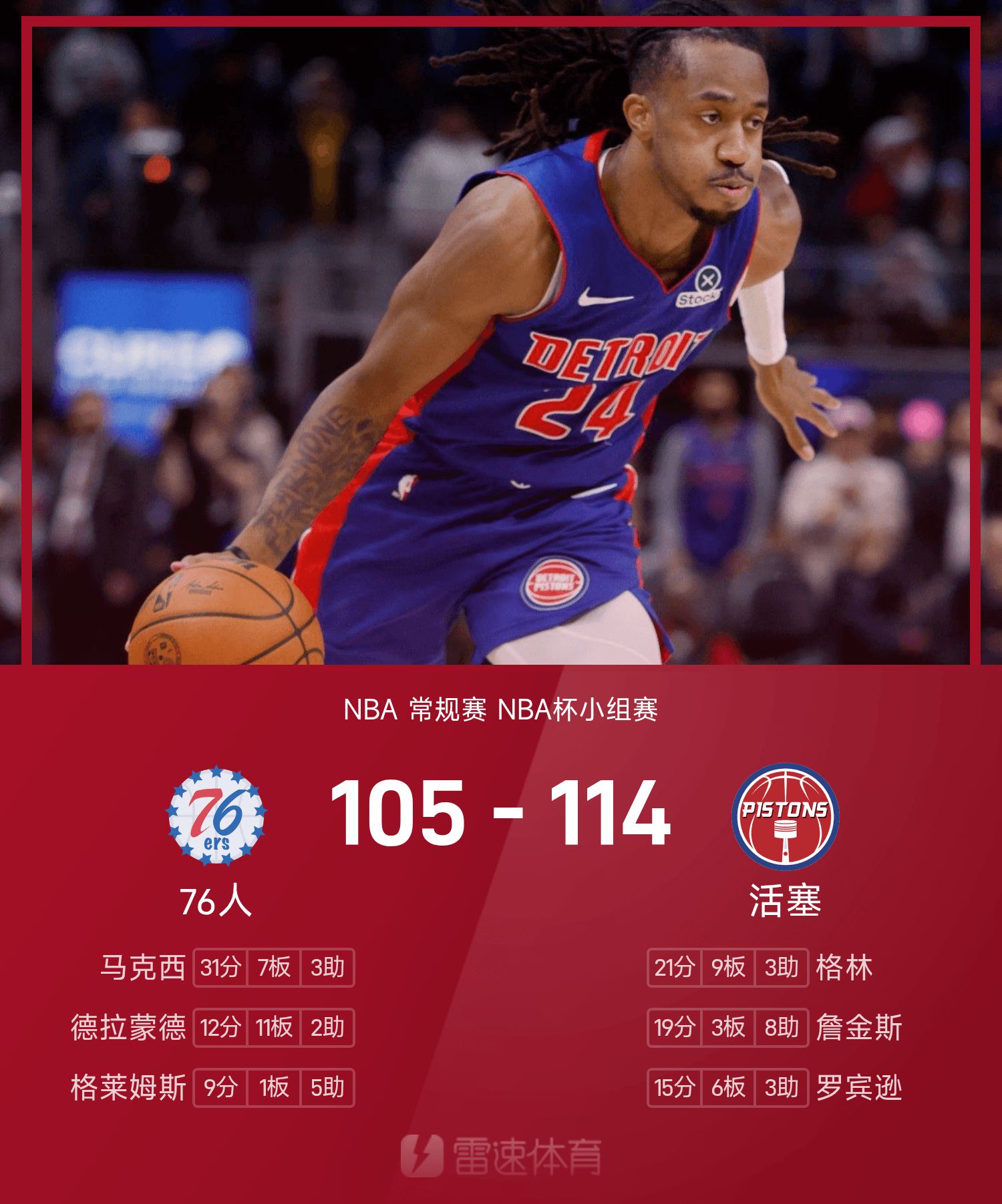 With 5 of 8 three-pointers, Jenkins led the Pistons without Cunningham to defeat the 76ers with 19 points, 3 rebounds and 8 assists. Maxi scored 31 points, 7 rebounds and 3 assists.