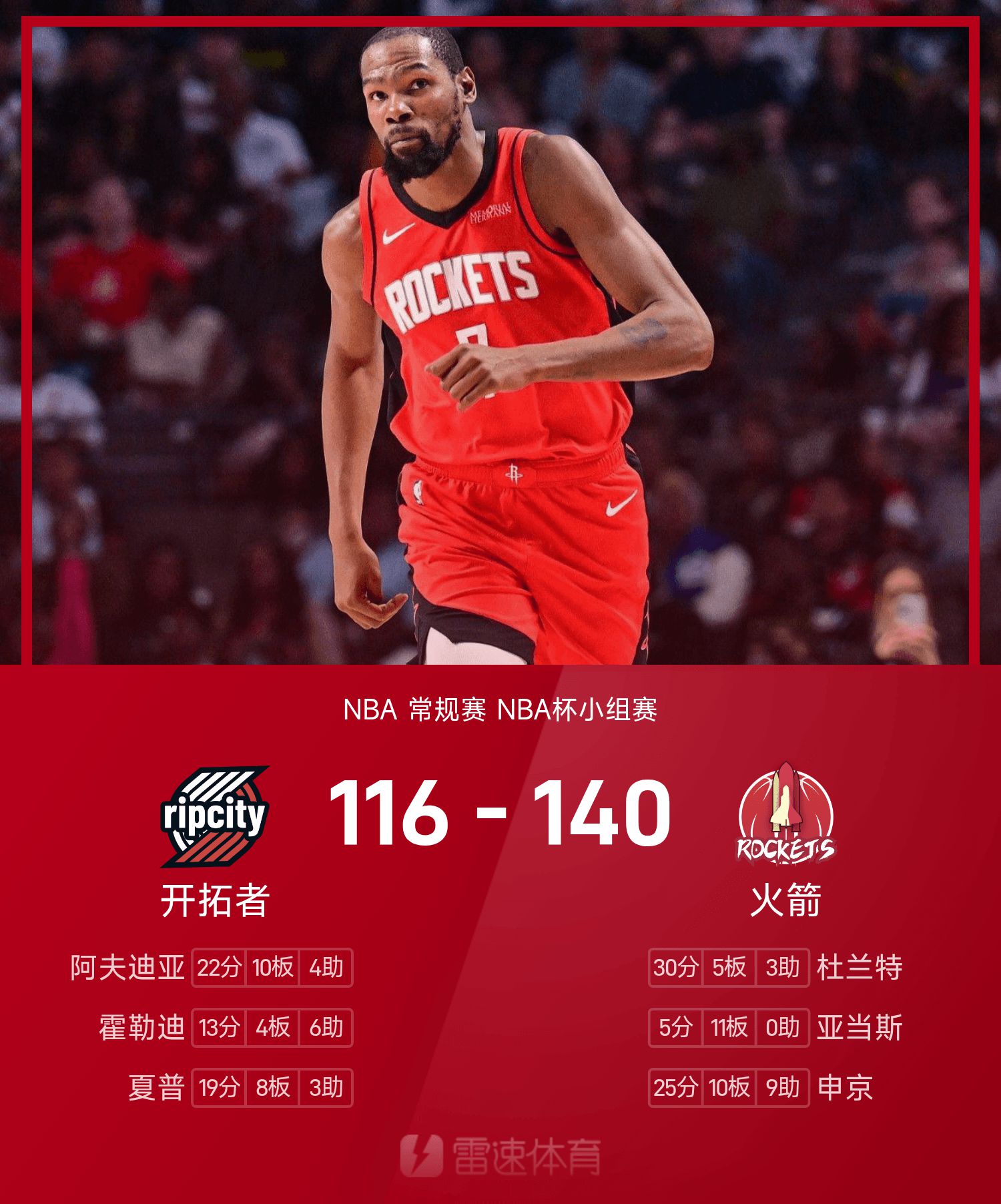 With a plus-minus value of +37, Durant efficiently scored 30 points, 5 rebounds and 3 assists, leading the Rockets to an easy victory over the Trail Blazers.