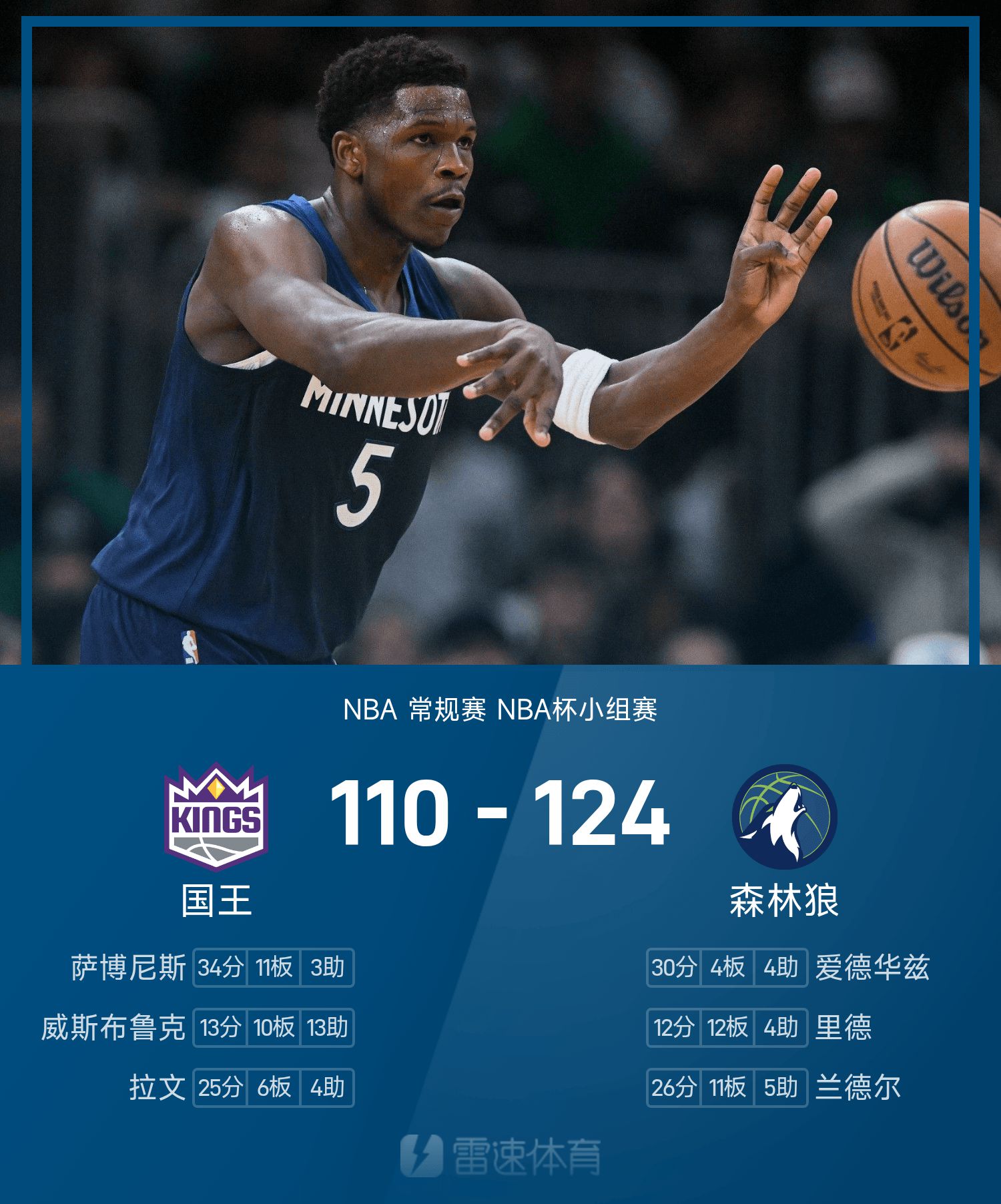 Edwards led the team to four consecutive victories with 30 points, 4 rebounds and 4 assists. Sabonis scored 34 points, 11 rebounds and 3 assists.