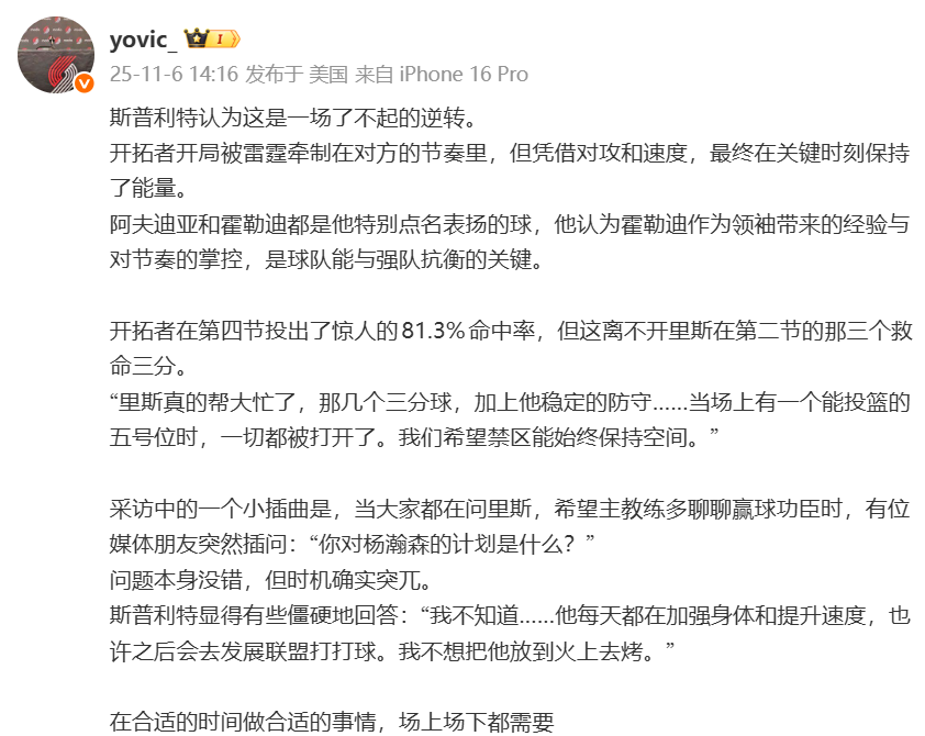 According to media person @yovic_, after the game, Trail Blazers interim coach Split said about Yang Hansen: "Yang Hansen is strengthening his body and improving his speed every day. He may go to the Development League to play in the game. I don't want to put him on the fire."