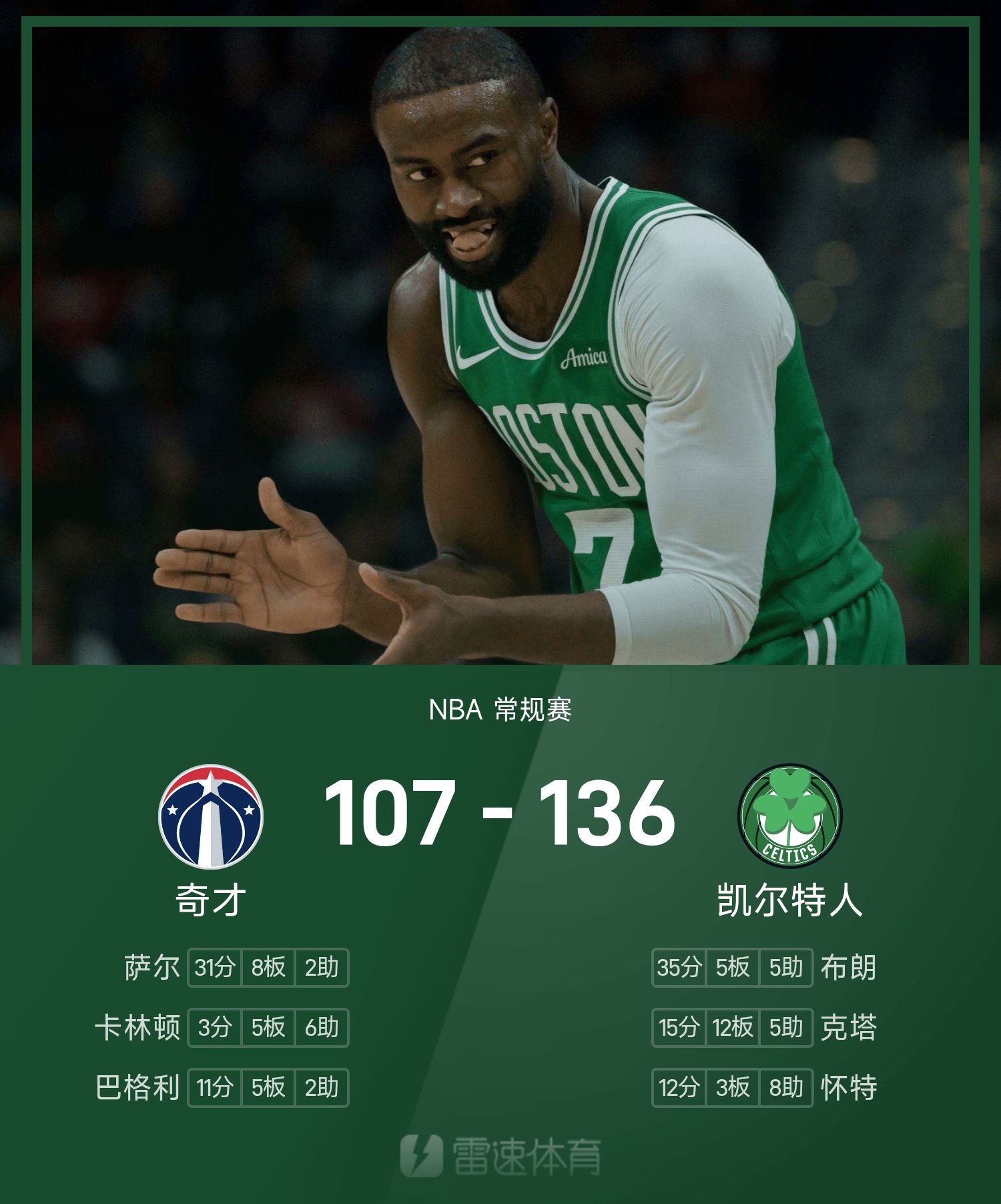 Jaylen Brown scored 35 points, and 6 Celtics scored in double figures to beat the Wizards.