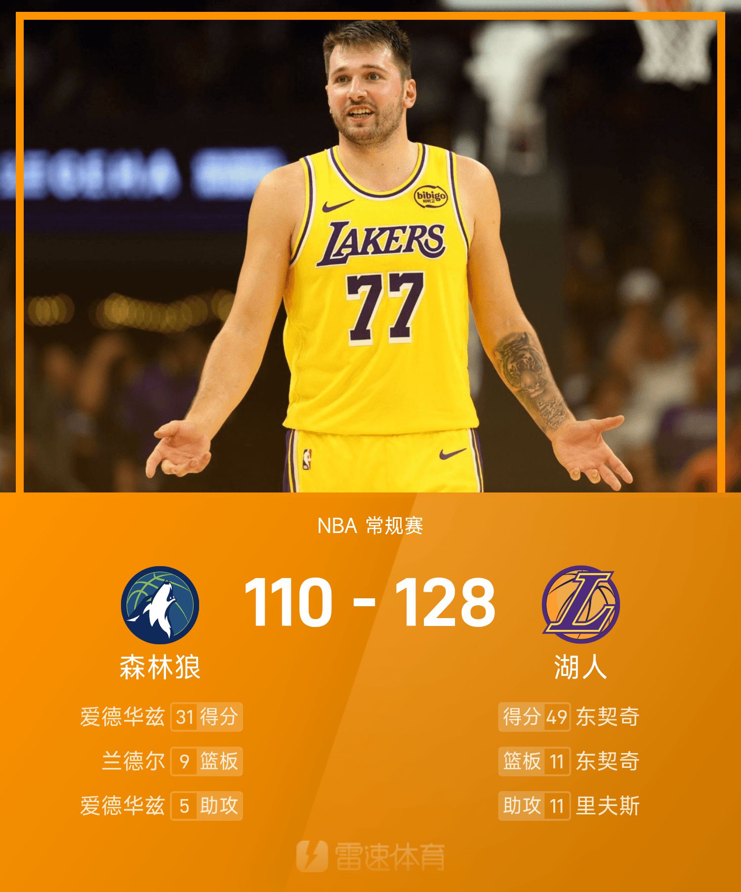 6686 Sports October 25th In the 25/26 NBA regular season, the Lakers played against the Timberwolves. At the end of the game, the Lakers defeated the Timberwolves 128-110. Doncic scored a game-high 49 points, 11 rebounds and 8 assists, leading the Lakers to victory.