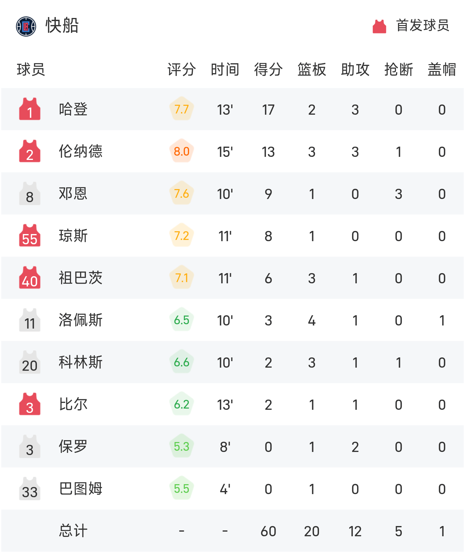 Harden made 5 of 6 three-pointers and efficiently scored 26 points, 3 rebounds and 4 assists. Booker only scored 8 points. The Clippers 72-56 Suns at halftime.