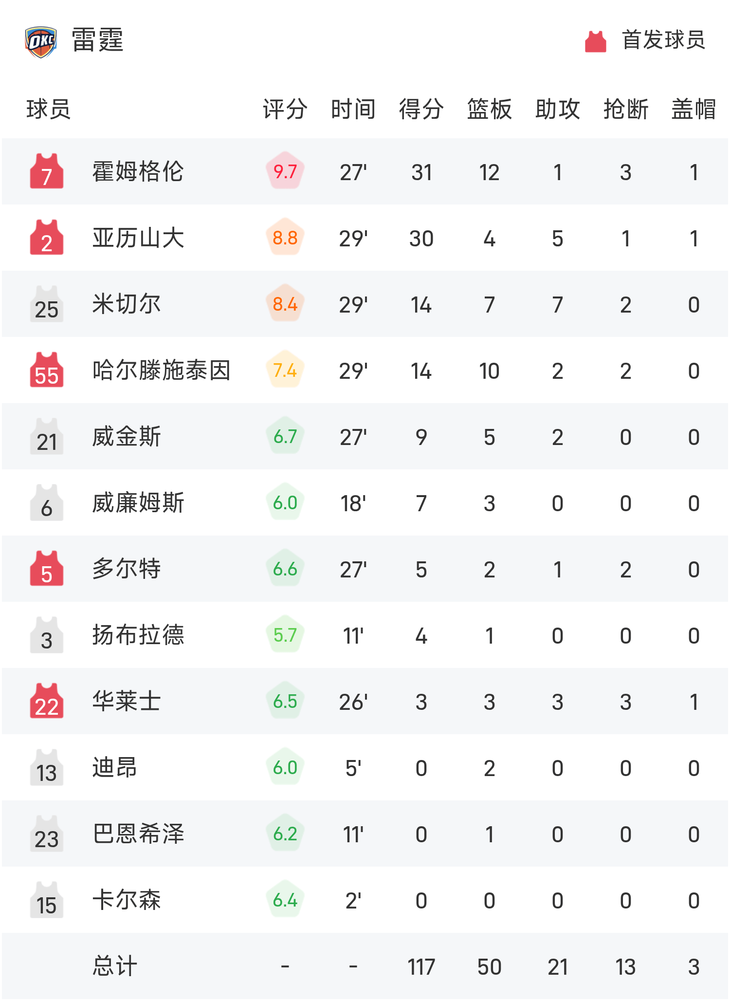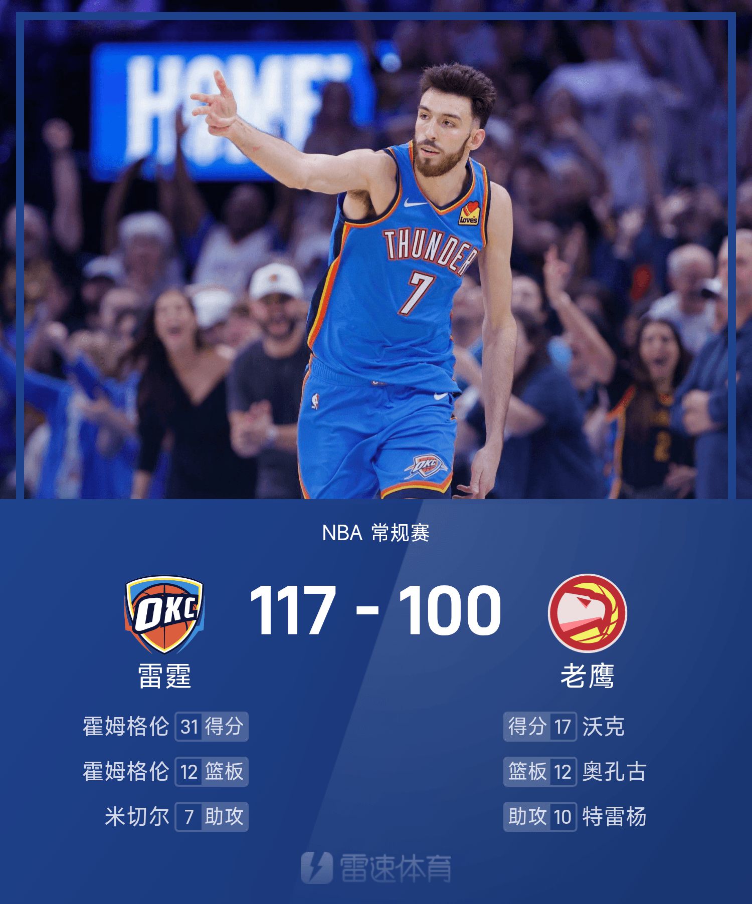 Holmgren scored a game-high 31 points, 12 rebounds and 1 assist, leading the Thunder to victory.