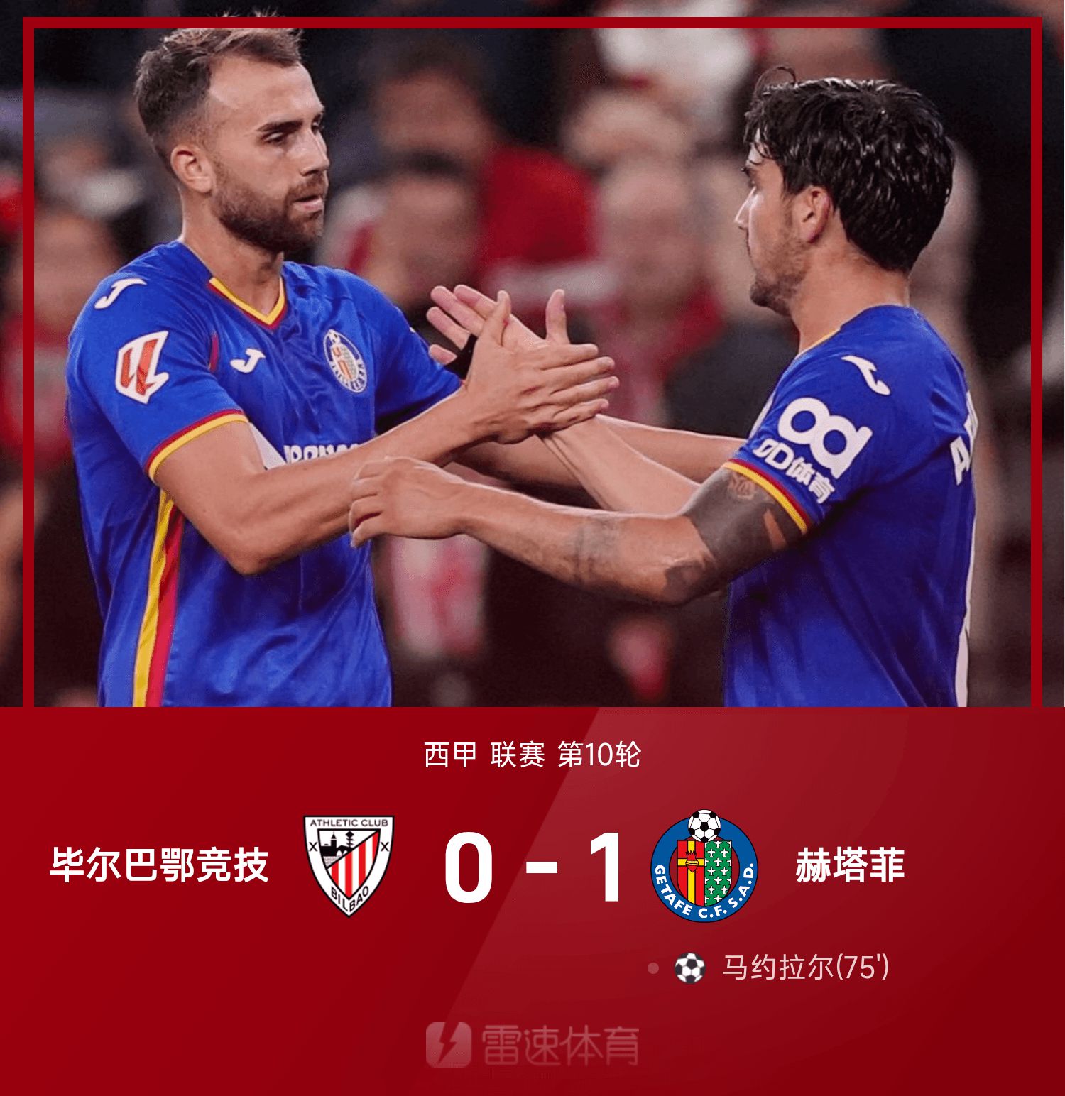 6686 Sports News on October 26 In the 10th round of the 25/26 La Liga season, in the first half, neither team made any achievements. In the second half, in the 75th minute, the deadlock was finally broken. Mayoral followed up with a shot and scored. In the end, Getafe defeated Bibao 1-0 and the game ended.