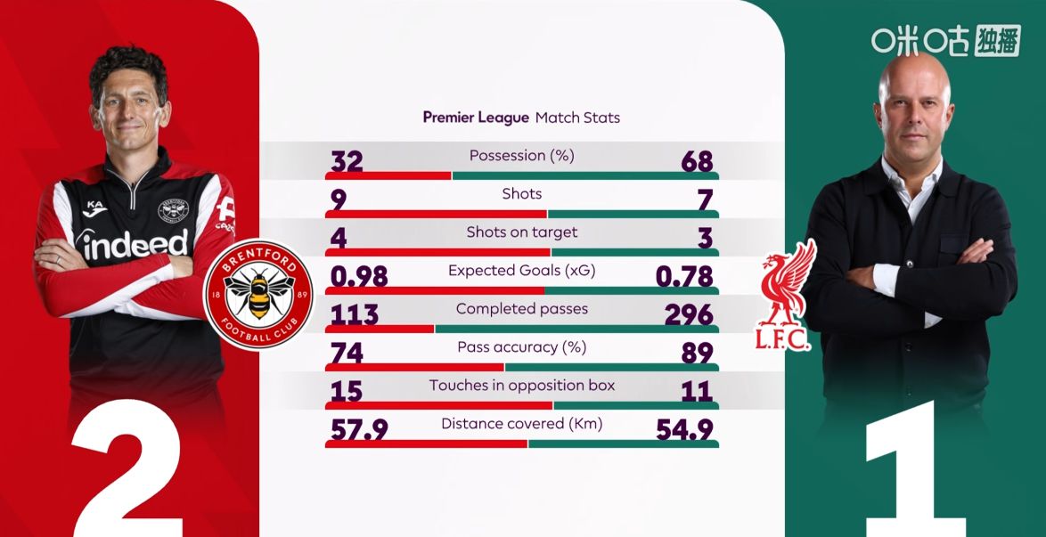 Liverpool vs Brentford half-time statistics: dribbling rate is 73, the home team has the upper hand in goals scored