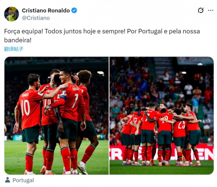 Absent from this game due to suspension! Cristiano Ronaldo posted a message on social media to cheer for his teammates: unite and fight for Portugal
