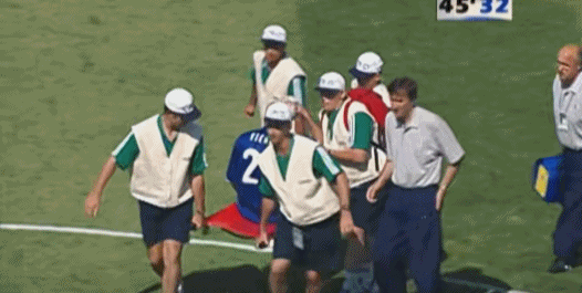 In the stoppage time of the first half, Cannavaro risked injury and pushed the ball over the end line.
