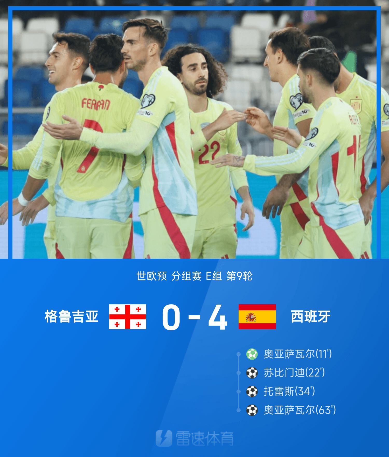 6686 Sports reported on November 16 that in the 9th round of Group E of the World European Preliminaries, Georgia played as the home team against Spain. In the first half of this campaign, Oyarzabal opened the scoring with a 12-yard penalty, Subimendi scored with a single shot, and Torres received a cross pass in front of the goal and pushed into the far corner. After changing sides and fighting again, Oyarzabal received a pass from Torres and scored in the penalty area. The game ended, Spain 4-0 Georgia. After this round, Spain ranked first in the group with 15 points, and Türkiye ranked second in the group with 12 points. The two teams met in the final round.