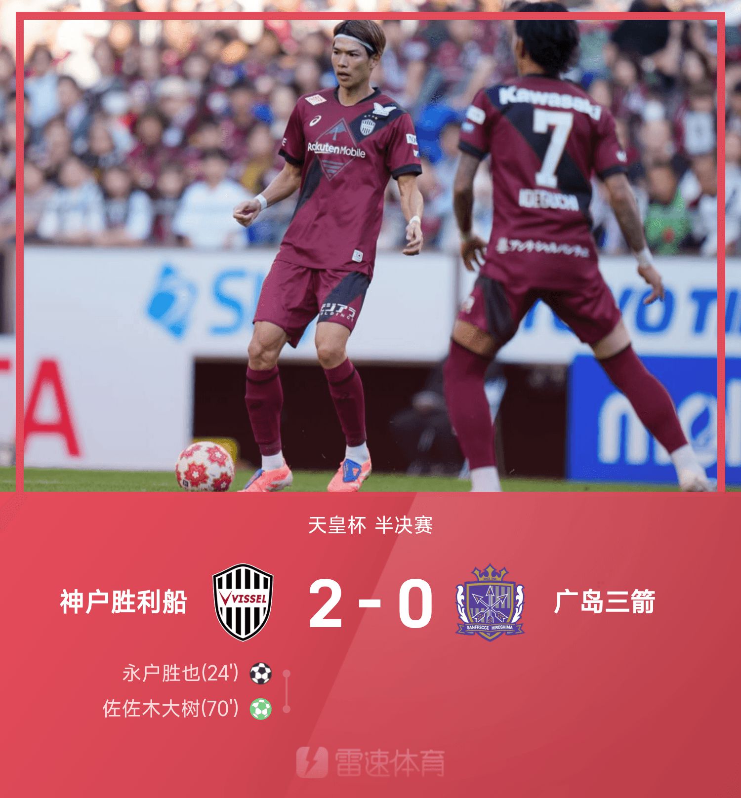 6686 Sports reported on November 16 that in the 25th Emperor's Cup semi-finals, Kobe won the 2-0 victory over Sanfrecce Hiroshima. In the first half, Katsuya Nagabe scored from the outside to help Kobe open the scoring. Changing side to fight again, Isamu Osako took a 12-yard penalty and was saved. However, the Hiroshima Sanfrecce goalkeeper moved ahead and was severely punished. In the end, Daiki Sasaki hit a point shot to help Kobe win the game and seal the victory, and enter the Emperor's Cup finals for two consecutive years.