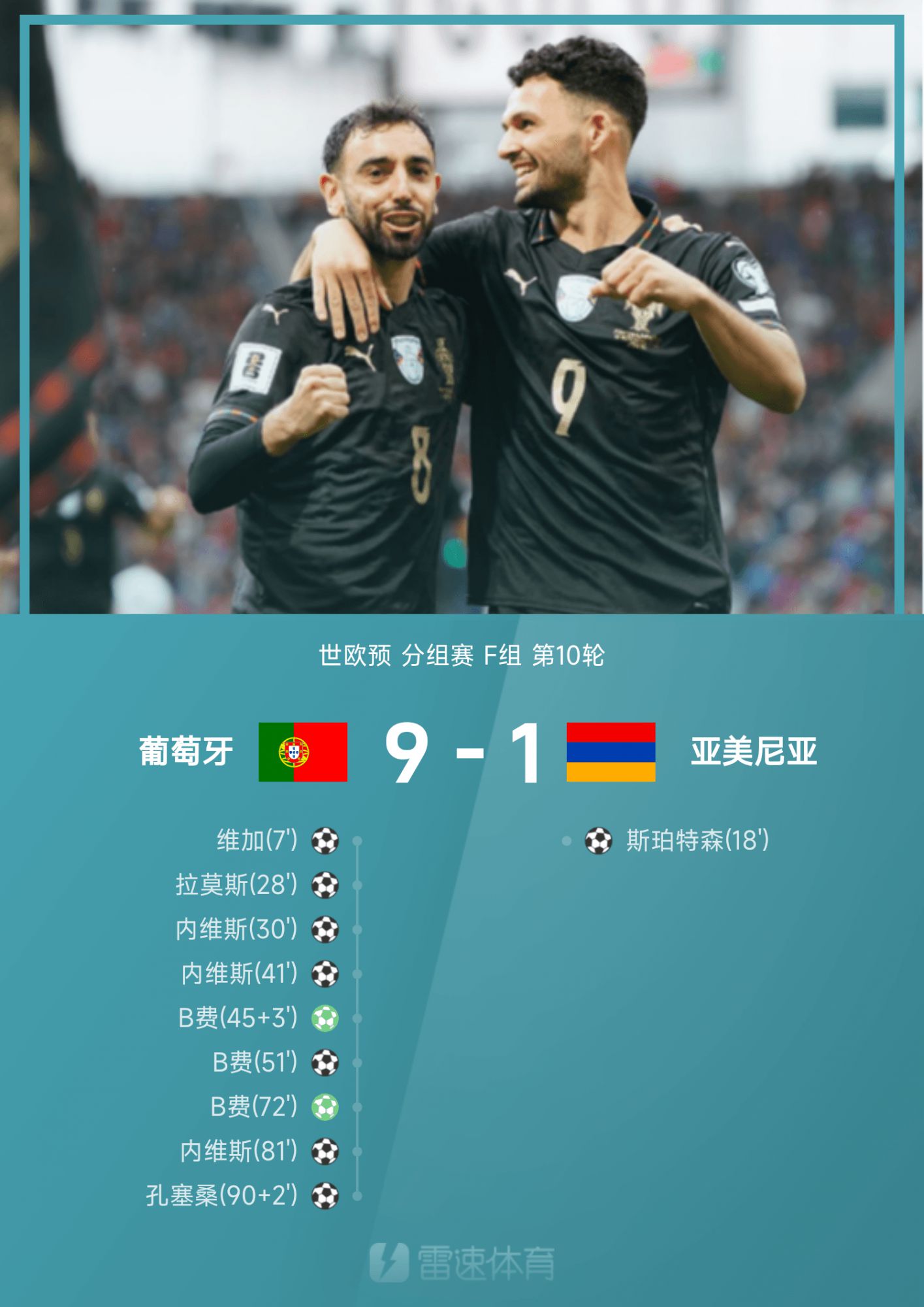 6686 Sports reported on November 16 that in the 10th round of Group F of the 2026 World European Qualifiers, the Portuguese home team defeated Armenia 9-1. Vega blitzed for Portugal, and then Spertson equalized the score for Armenia; in the next game, the Portuguese team was like a god of help, Neves and B Fee completed hat tricks one after another, Ramos sent a pass and shot, and Conceição added icing on the cake for the team. Portugal finished first in Group F with 13 points with 4 wins, 1 draw and 1 loss, and directly qualified for the 2026 United States, Canada and Mexico World Cup.