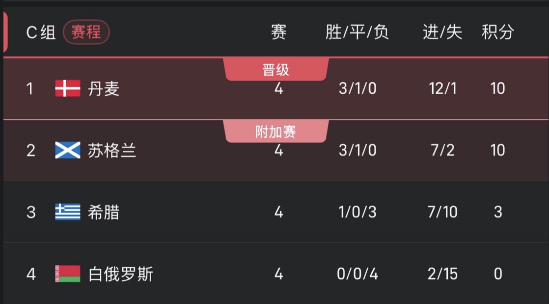 Denmark and Scotland have the same points. The two teams will compete directly in Glasgow in the final round to compete for the top spot in the group.