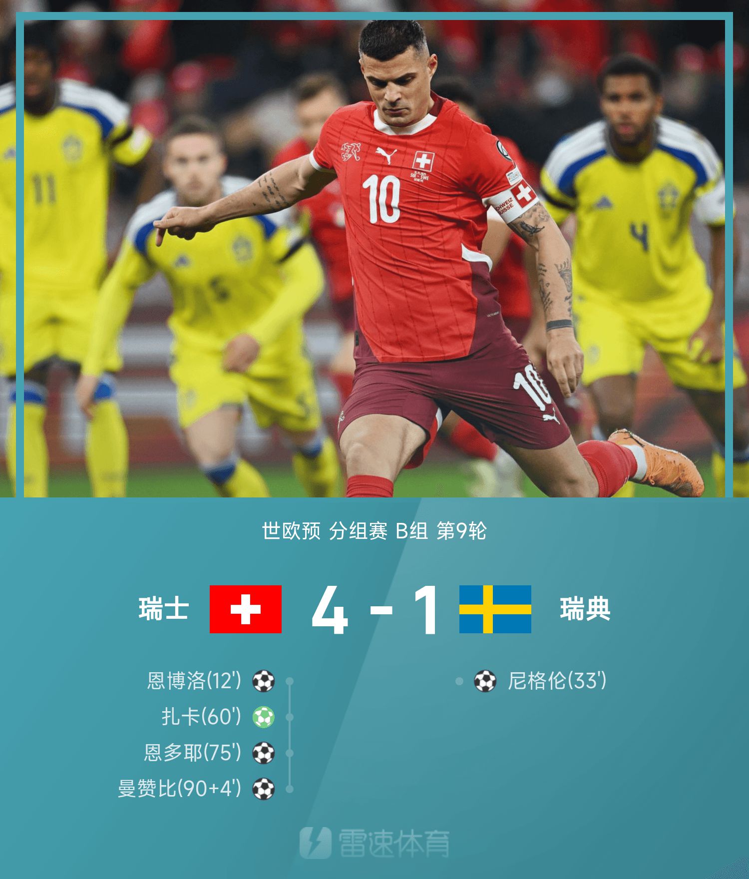 6686 Sports reported on November 16 that in the 9th round of Group B of the 2026 World European Qualifiers, the Swiss home team defeated Sweden 4-1. In the first half of the game, Embolo opened the scoring for Switzerland, and Nygren shot to equalize; in the second half of the game, Xhaka scored with a shot, Ndoye completed the pass, and Manzambi scored the icing on the cake. Switzerland leads the way with 13 points with 4 wins and 1 draw. Kosovo, which is behind the leader, has 3 points. It also has a large lead in goal difference and firmly holds the initiative to qualify for the World Cup in the United States, Canada and Mexico.