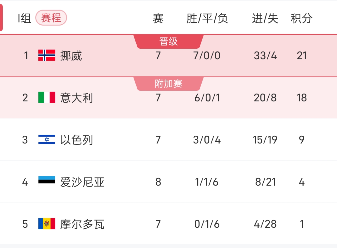 At 3:45 am Beijing time tomorrow, Italy will face Norway again at the home team stadium. Norway currently leads Italy by 3 points and has a 17-goal difference advantage, which also means that Italy must win by more than 9 goals to reverse the opponent's situation and advance to the top of the group. This is basically an impossible task. It can be said that Norway is infinitely close to qualifying for the World Cup, while Italy is expected to enter the play-offs for the third consecutive time.