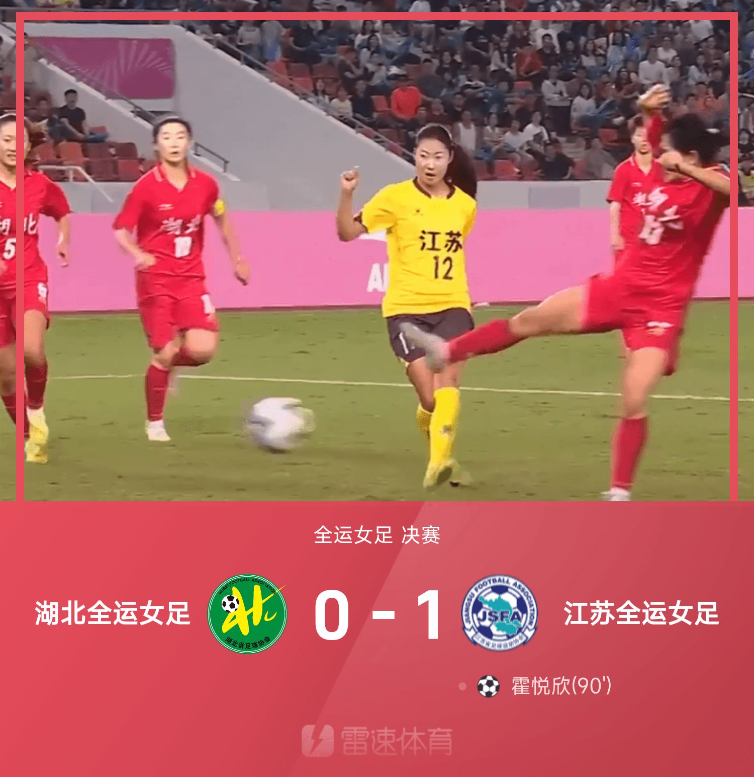 6686 Sports News on November 15 In the 15th National Games Women's Football Finals, the Jiangsu National Games Women's Football Team defeated the Hubei National Games Women's Football Team 1-0. Huo Yuexin made the final shot in the 90th minute. Throughout the game, Huo Yuexin scored the last shot in the 90th minute. The Jiangsu women's football team won the gold medal in this National Games, while the Hubei women's football team finished second.