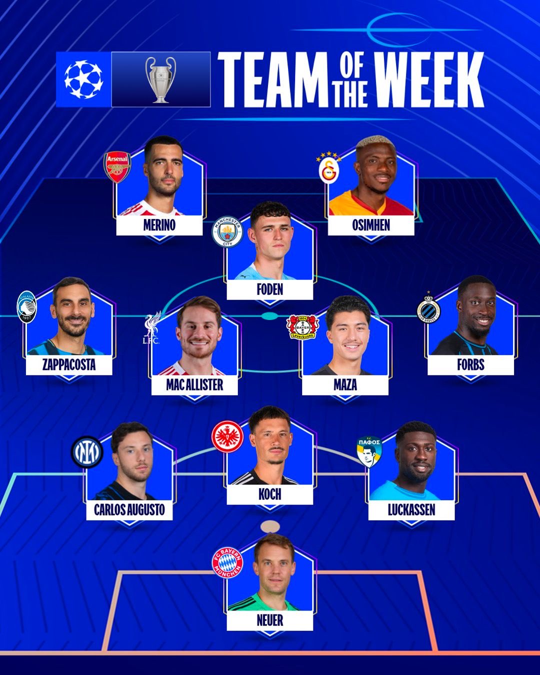 6686 Sports News on November 7th UEFA officially announced the team of the week for the fourth round of the league stage. Osimhen and Neuer lead the list, with Foden, McAllister and Merino included.