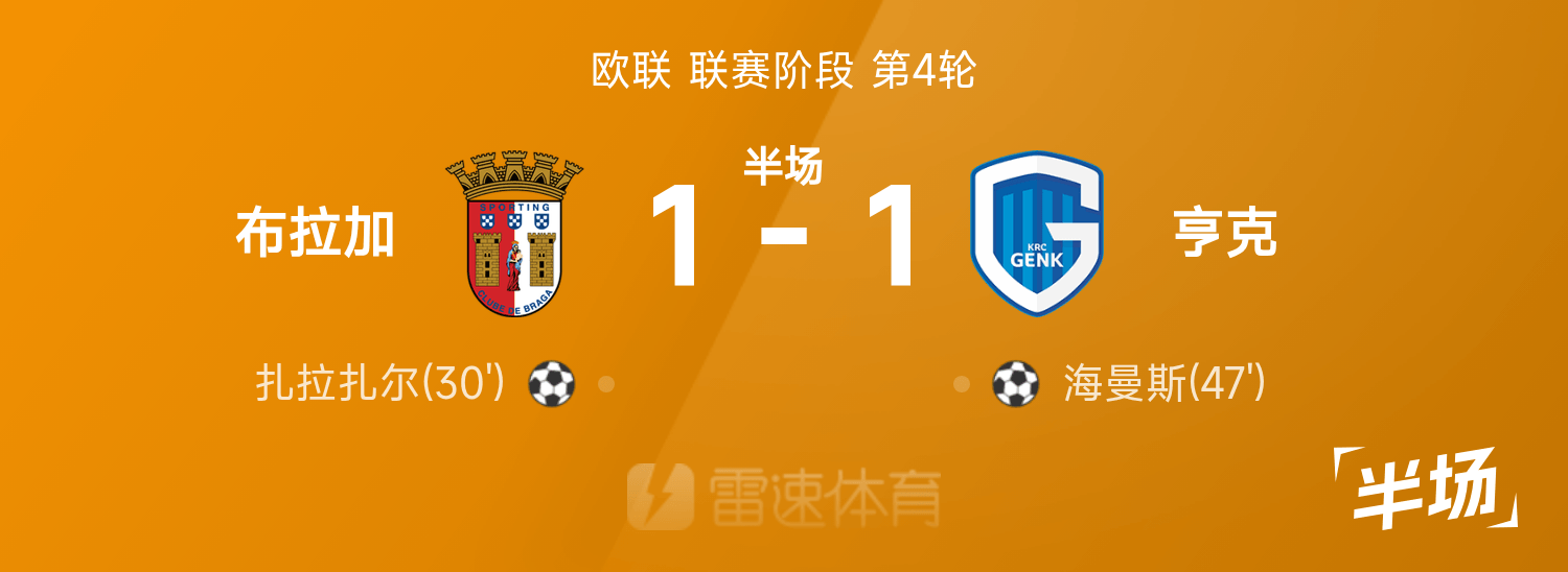 6686 Sports November 07 In the fourth round of the 25/26 Europa League, Braga faced Genk. After halftime, the score between the two sides was Braga 1-1 Genk, with Zalazar and Heymans scoring.