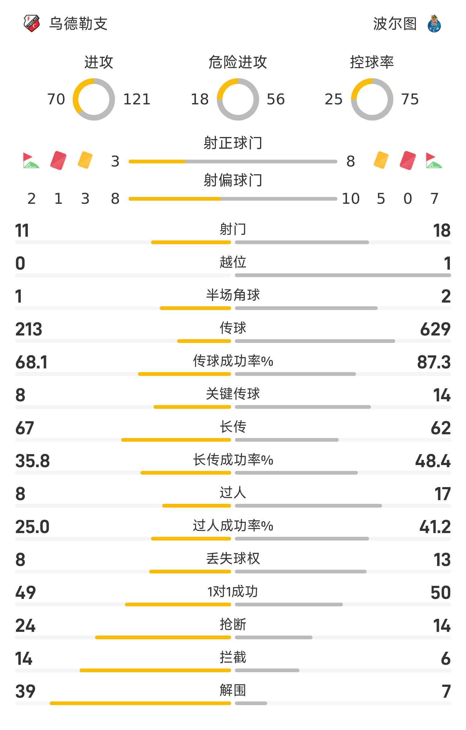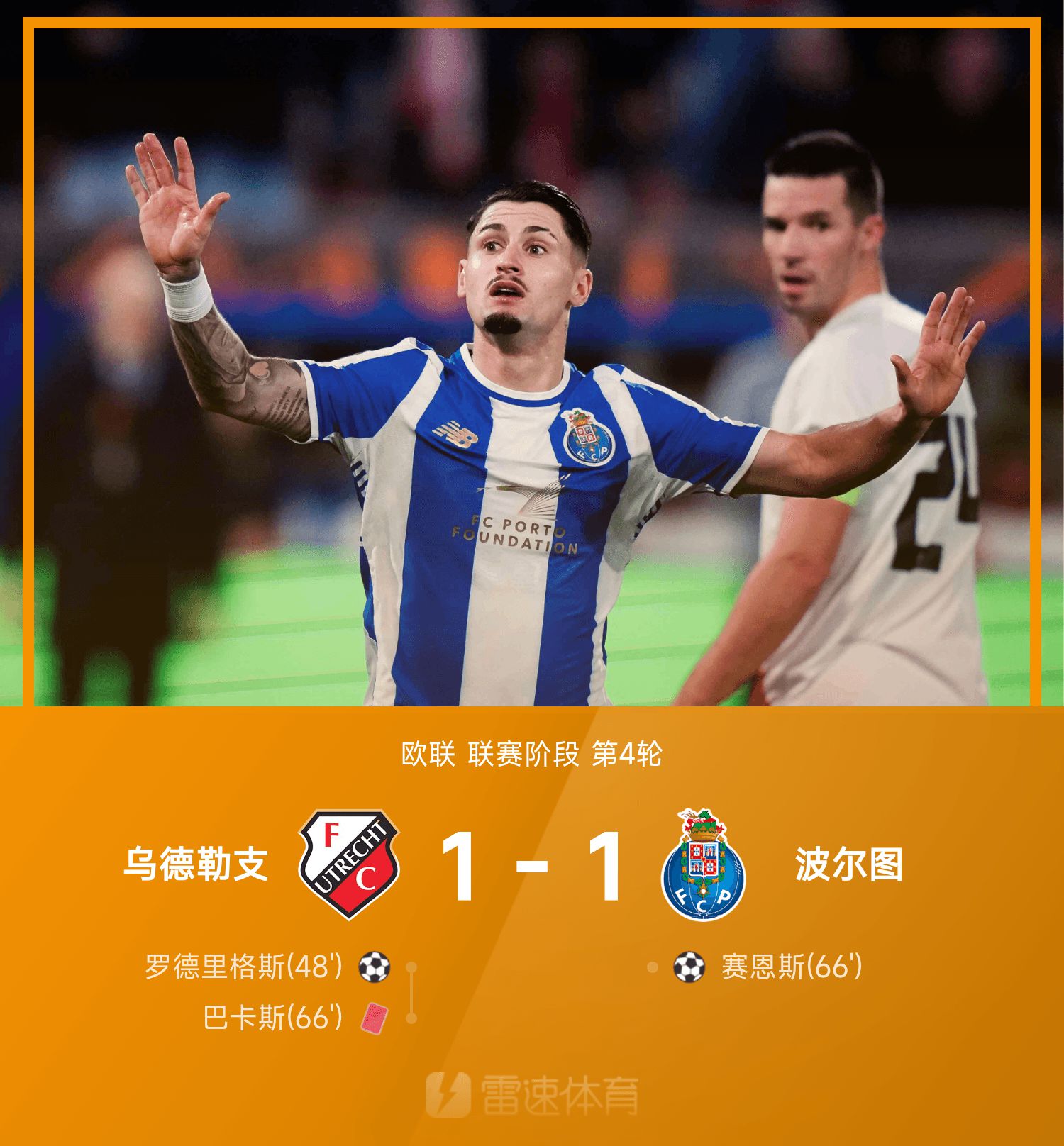 6686 Sports News on November 7th In the fourth round of the 25/26 Europa League, Utrecht played against Porto. In the first half, neither side achieved anything. In the second half, in the 48th minute, Rodriguez made a contribution to break the deadlock. Sainz scored an empty-net goal to equalize the score. During this period, Utrecht goalkeeper Bakas got into an argument with a Porto player and was sent off, and Utrecht responded with ten men. In the end, ten-man Utrecht drew 1-1 with Porto. The two sides shook hands and ended the game.