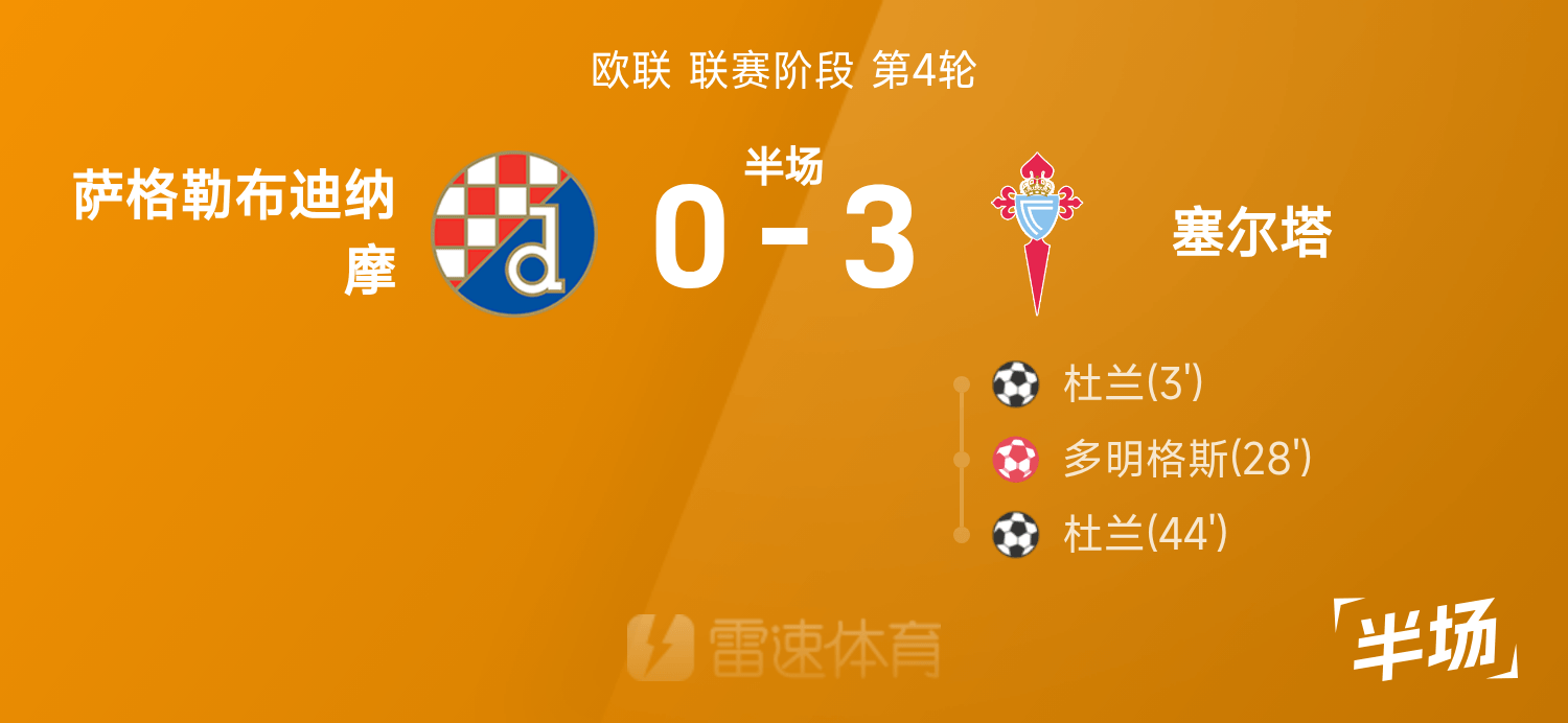 6686 Sports November 07 In the fourth round of the 25/26 Europa League, Dinamo Zagreb faced Celta Vigo. After halftime, the score between the two sides was Dinamo Zagreb 0-3 Celta. Duran scored twice and Dominguez scored an own goal.