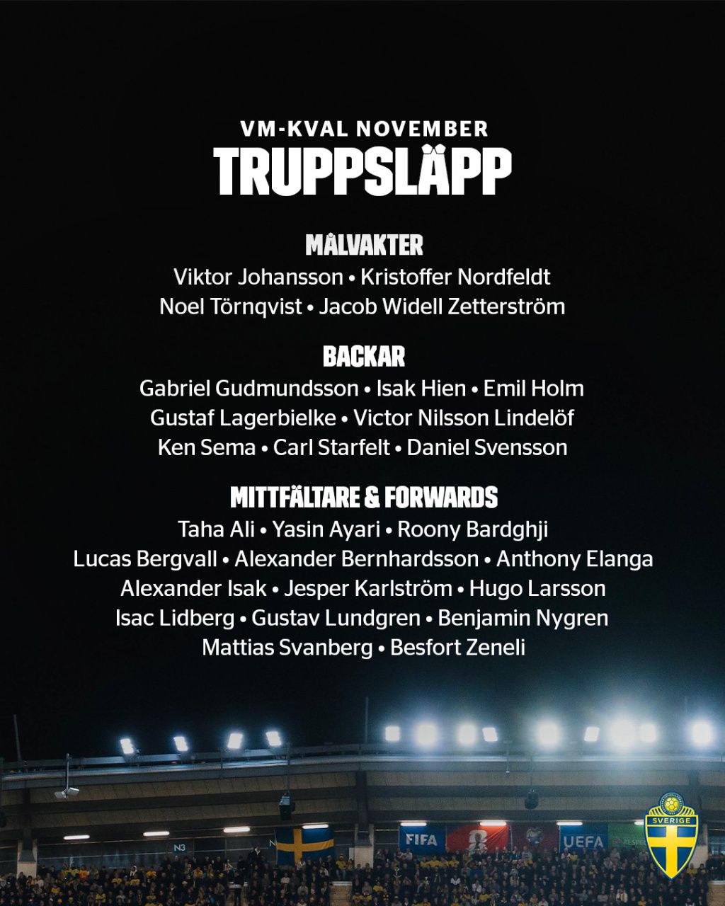 Defense: Dan Neil Svensson (Borussia Dortmund), Sheen (Atalanta), Gudmundsson (Leeds United), Lagerbierke (Braga), Sema (Paphos FC), Holm (Bologna), Victor Lindelof (Aston Villa), Stafelt (Celta Vigo)