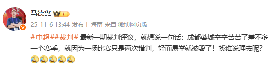 In this regard, sports reporter Ma Dexing said: "Chengdu Chengdu has worked hard for almost a season, but just because of two wrong decisions in one game, it was easily ruined! Who can I ask to reason?"