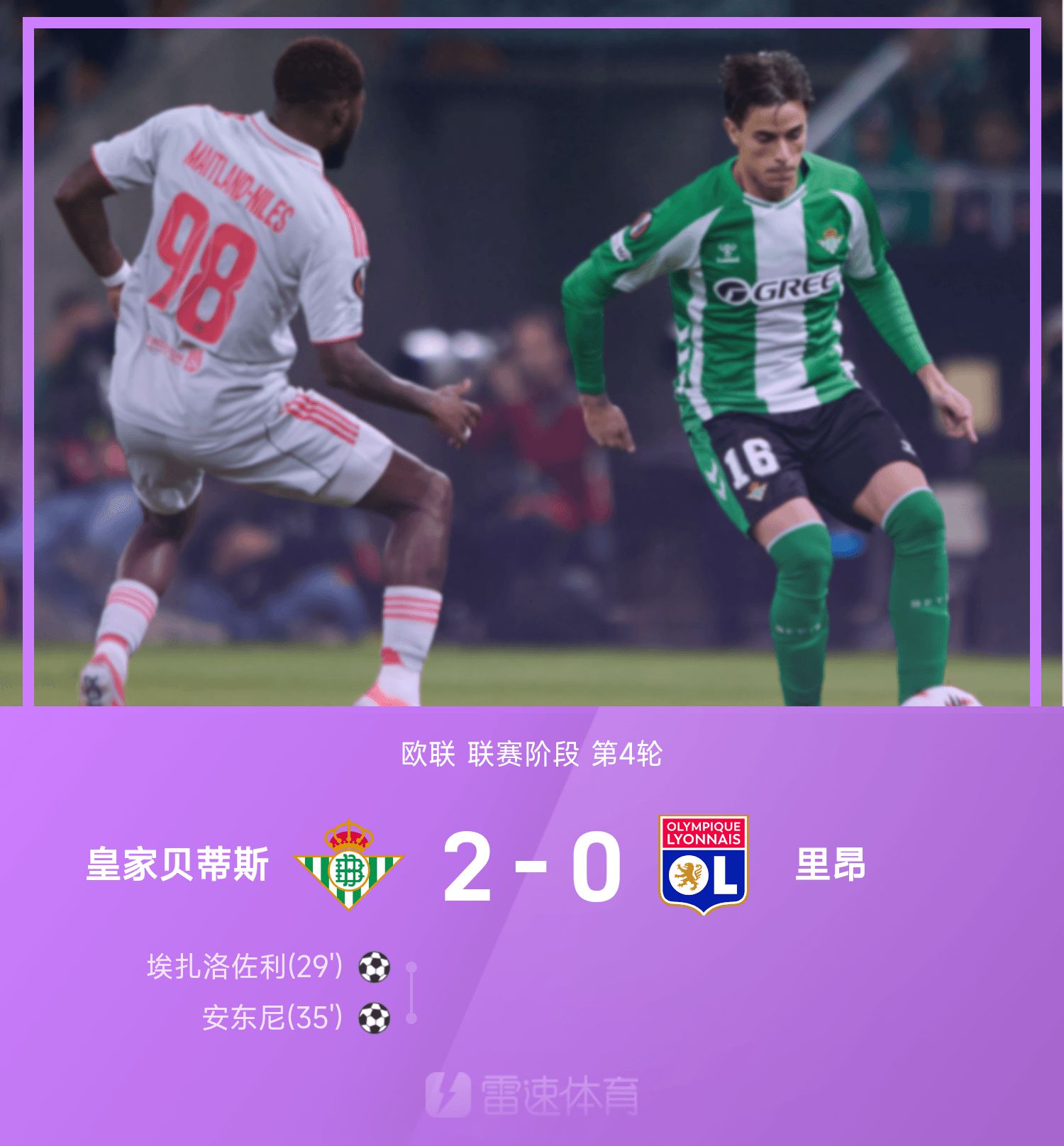 6686 Sports News on November 7th In the fourth round of the 25/26 Europa League, Real Betis faced Lyon. In the 29th minute of the first half, Bakambu assisted Ezzarozzoli to score, and Real Betis took the lead. In the 35th minute, Rocca took a free kick and passed the ball. Anthony made a calm shot with a single shot to change the score to 2-0. Neither team made any achievements in the second half. In the end, Real Betis defeated Lyon 2-0 at home.