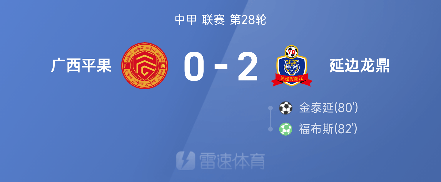 6686 Sports October 26th In the 28th round of the 25th Chinese League One, Yanbian Longding defeated Guangxi Pingguo 2-0. Throughout the game, Forbes and Kim Tae-yeon scored goals.
