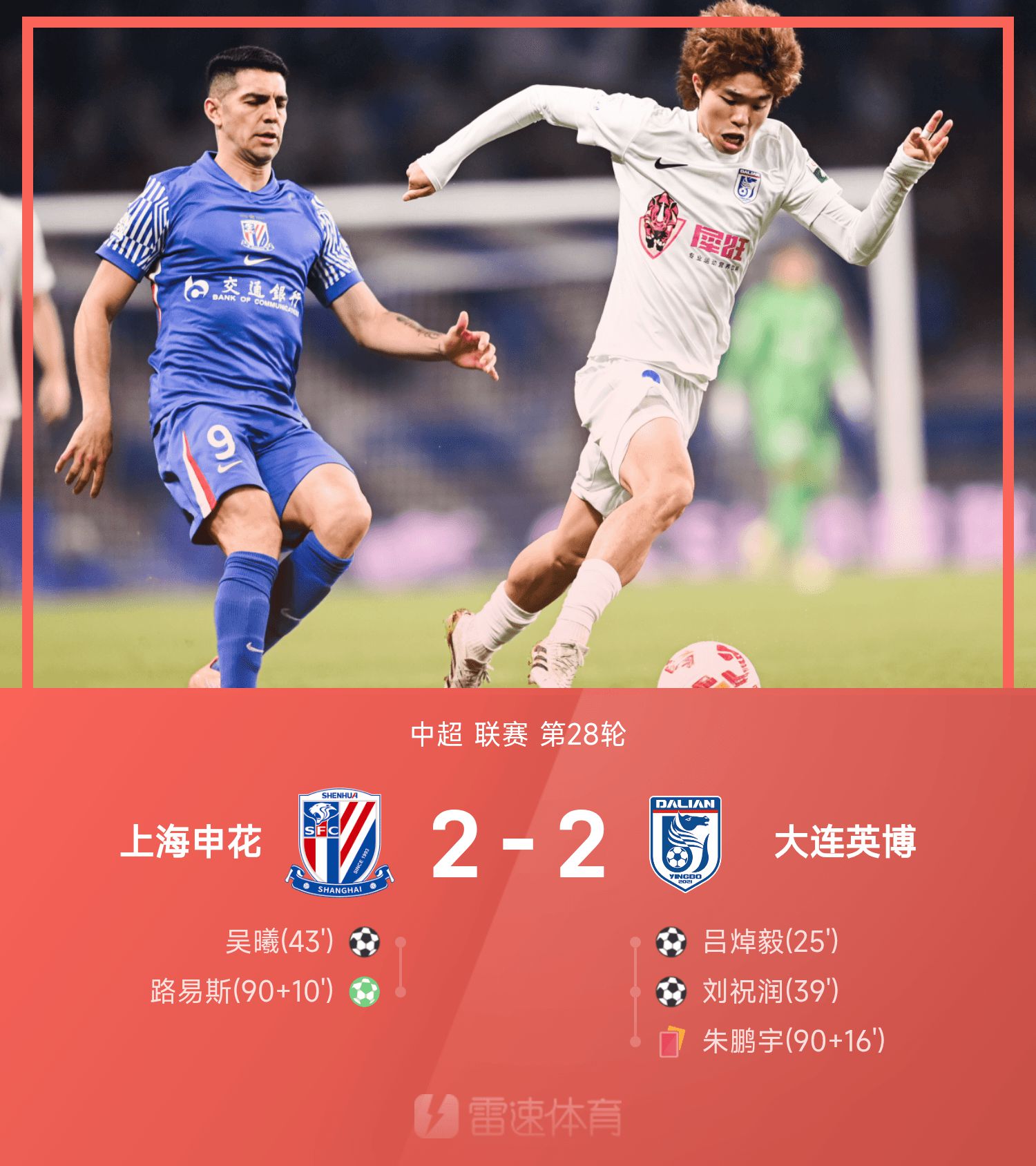 Chinese Super League match report: Wu Xi made contributions + points, Luiz scored a draw in stoppage time, Shenhua 2-2 Yingbo