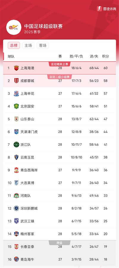 Haigang ended its four-game winning streak in the league. In the latest standings, the team still tops the list, but is only 2 points ahead of Chengdu. If Chengda beats Qingdao West Coast tonight, it will rise to the top. Shenhua will face Dalian Yingbo tonight, and the team is temporarily ranked third with 57 points.